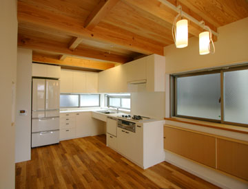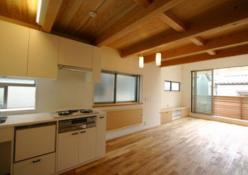 内装は白を基調にして、一部梁など木を現し自然素材のもつ暖かさをもたせています。2階リビングとデッキの床は、無垢材を使用、天井の針葉樹合板は、ロフトの床材と兼用しています。