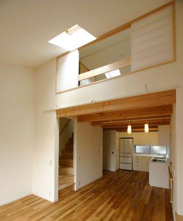 以前の住まいにも独立したロフトがあったのですが、リフォームにあたって2階のリビングと繋げることを考えました。障子戸を開放するとリビングと視覚的に連続し、家族の気配が感じられるようになりました。また、デッキからの風が通り抜け、室内環境的にも一体化となっています。また新設したトップライトからの光は、リビングだけでなく、障子を閉めていてもロフトに柔らかい光を導いています。
